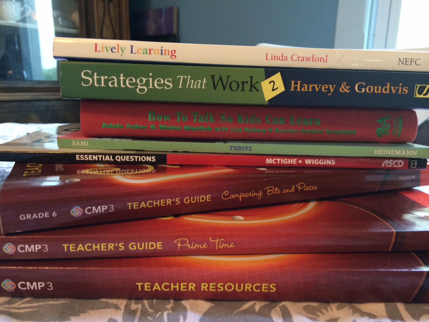 Professional books to read, to help me plan my year. Everything from my new Math Teacher Resources (I only brought 2 home so far…) to Thrive which I started and haven’t had time to finish, and Lively Learning for my classroom planning in general. Essential Questions to help me on the ELA curriculum committee. How to Talk So Kids Can Learn and Strategies That Work, both of which I can’t believe I haven’t ever read…