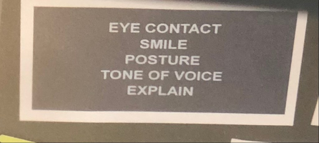 Suddenly, I had a lot of questions. Have they always had these reminders? If it is a new initiative, have all previous interactions been less friendly? I don’t think so. If it isn’t new, does that mean all these years, their friendly interactions have been forced by company policy? Yikes!