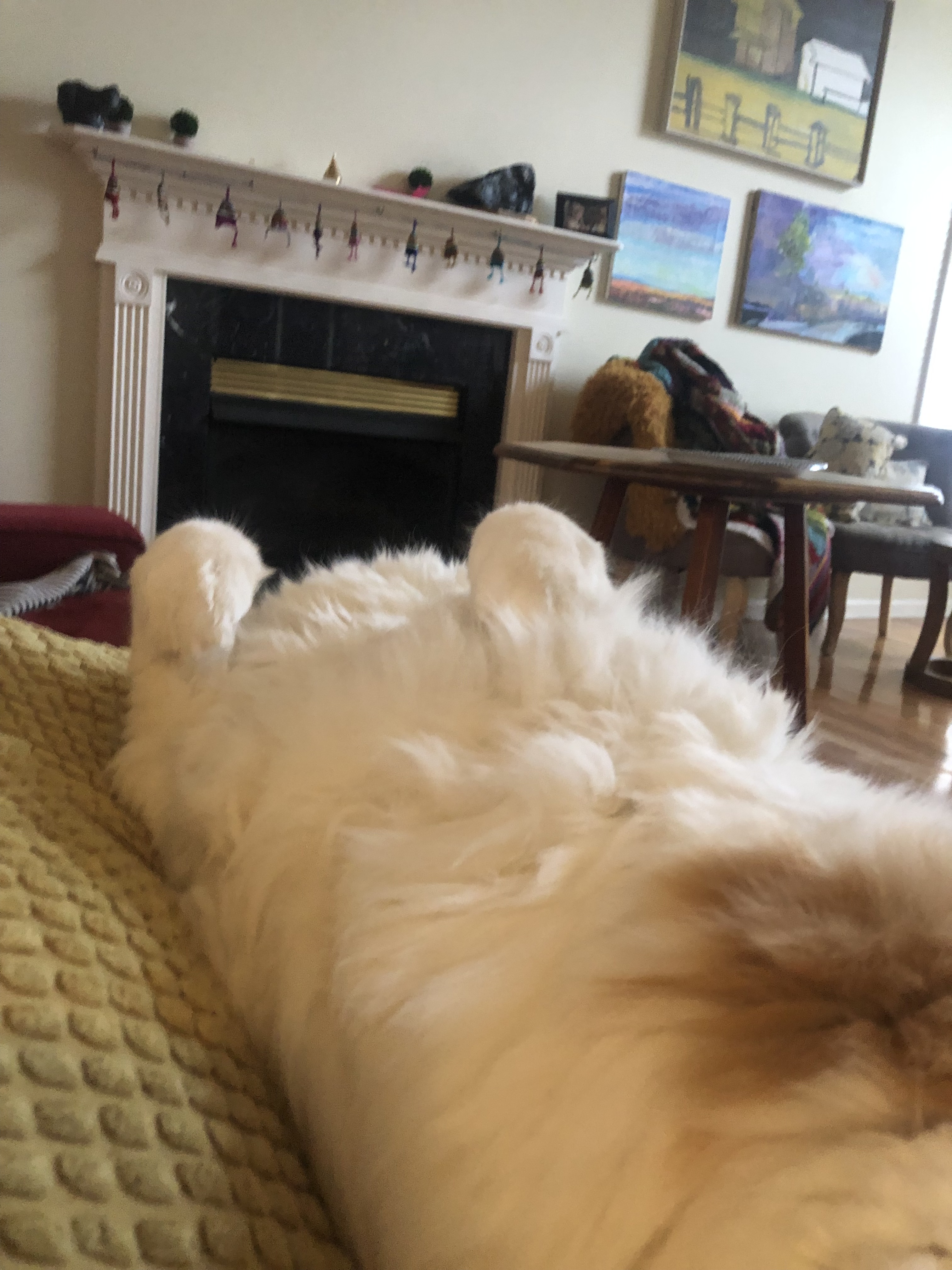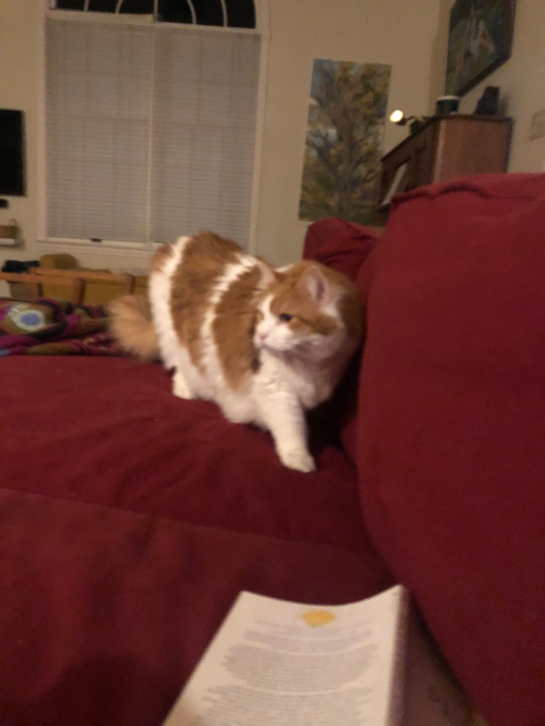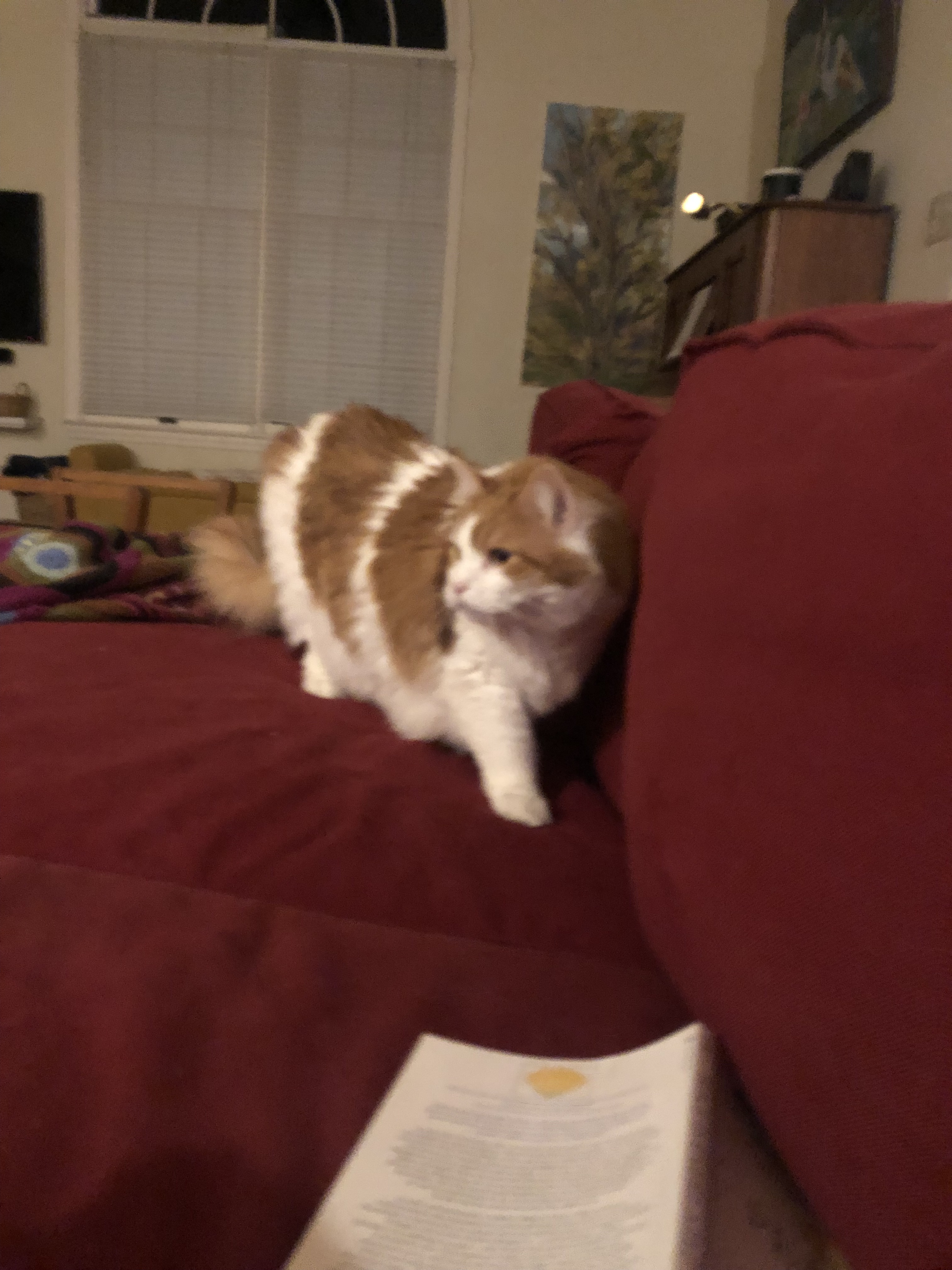 Sometimes he sneaks up, investigating the couch, slowly walking towards where I am reading. This is a familiar dance. He knows he needs to be careful.