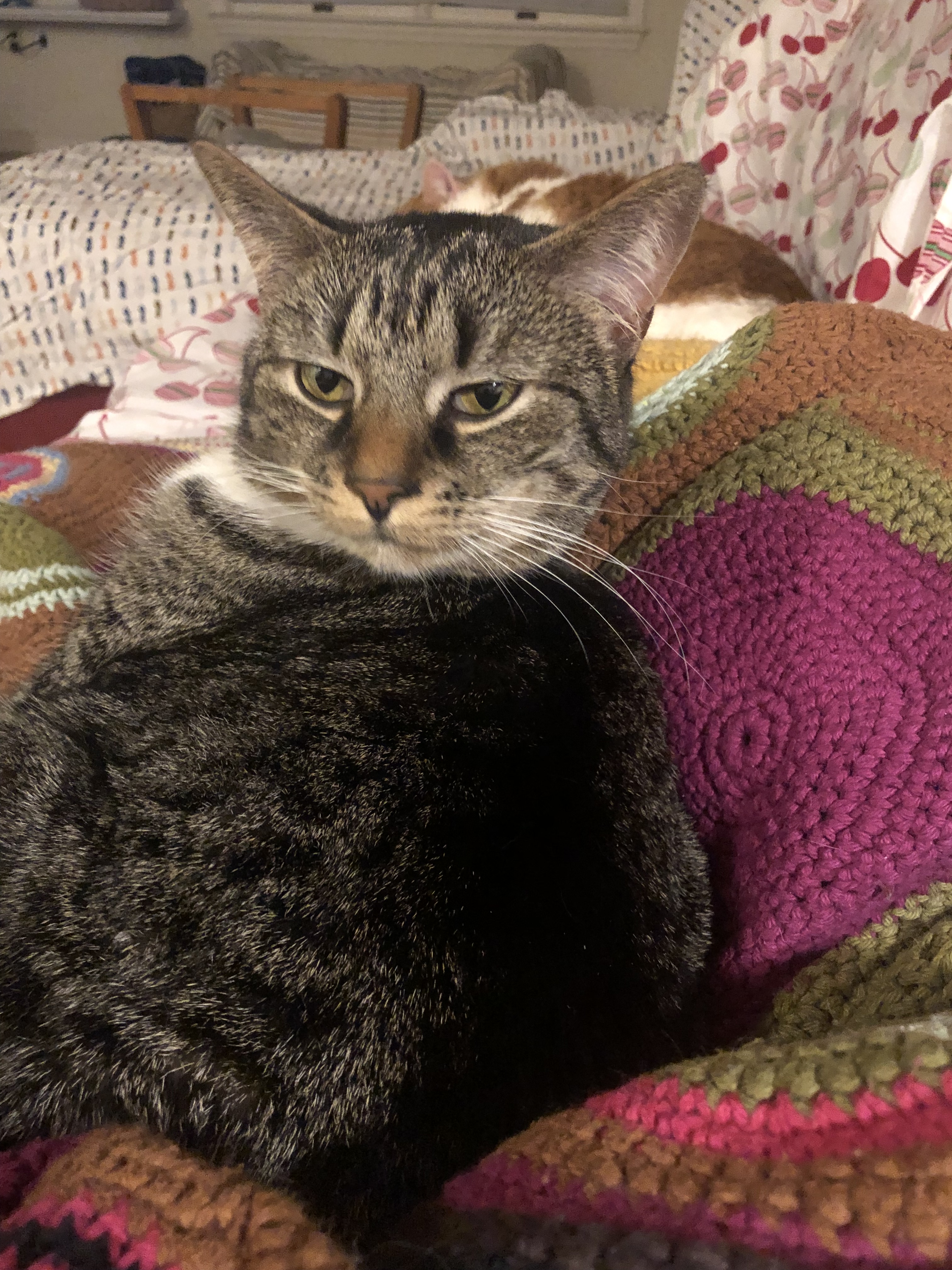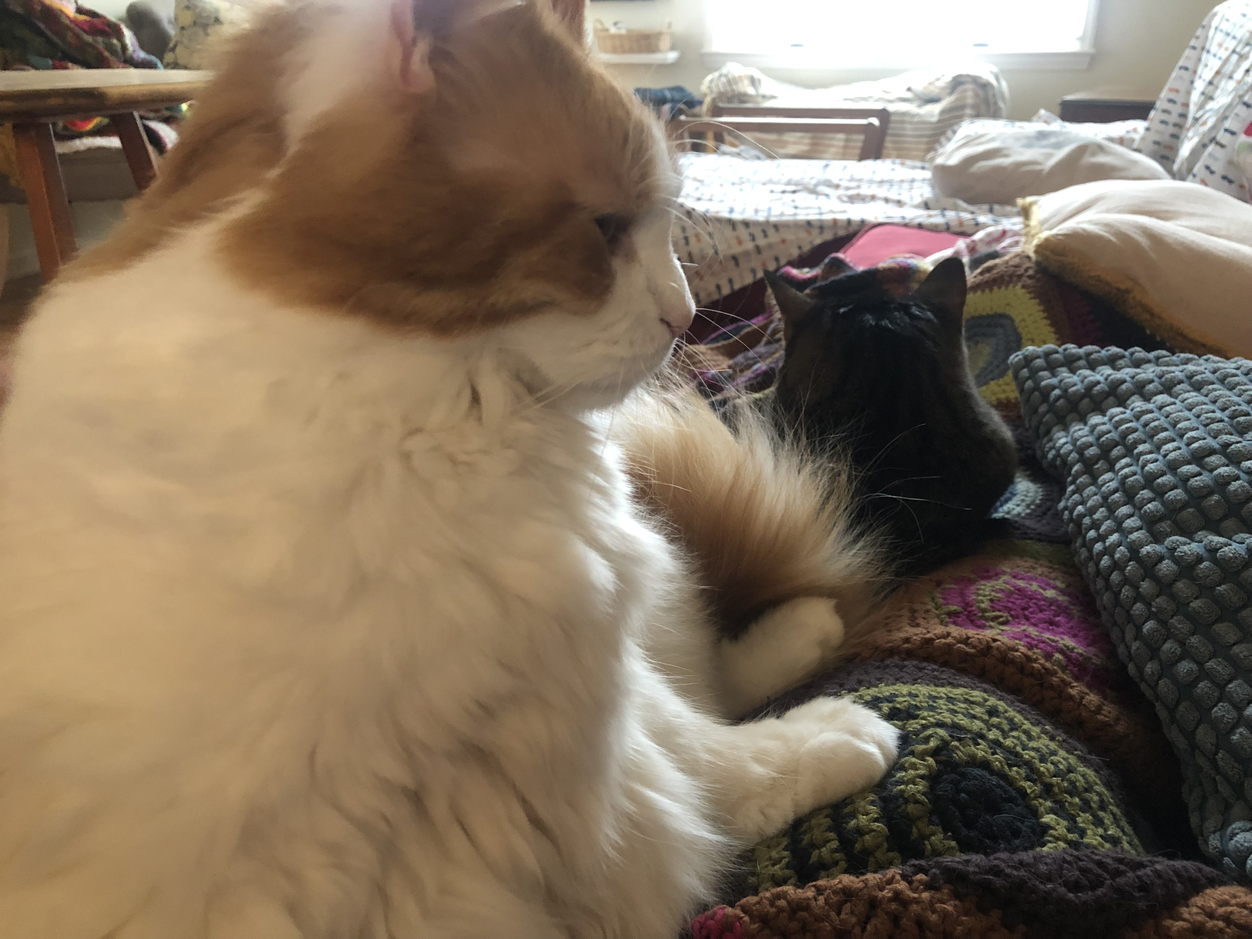 The truth about these cats and dogs is that they would be bestest of friends if they stopped being so possessive about snuggling me. They’ll touch noses sometimes, and I’ve seen Finn bring over a toy and ask Theodore to play. He’s usually not in the mood, but I’ve also seen him play with Finn’s tail. They have so much in common. I think maybe they hang out while I’m at work.