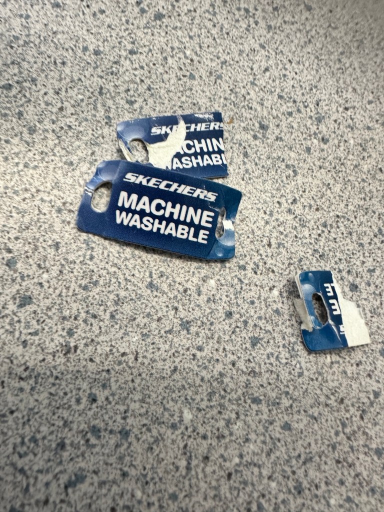 That’s when I realized it wasn’t a sticker on a shoelace charm. It was a cardboard tag on the laces, advertising that my shoes are machine washable.