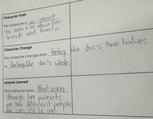 This work is hard. Have they done enough choice reading this year to do this work? We had encouraged them to find one of each kind of claim: a trait, a change, and a lesson. But, we had also given them an open book choice. We remember that not all books have a character change.