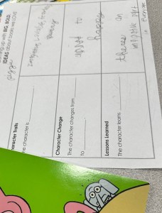 Students are working on their graphic organizers, thinking about their favorite book and making claims about the character’s trait or change, or lesson learned in the book. This is hard work! I walk around leaning in, checking in, coaching in.
