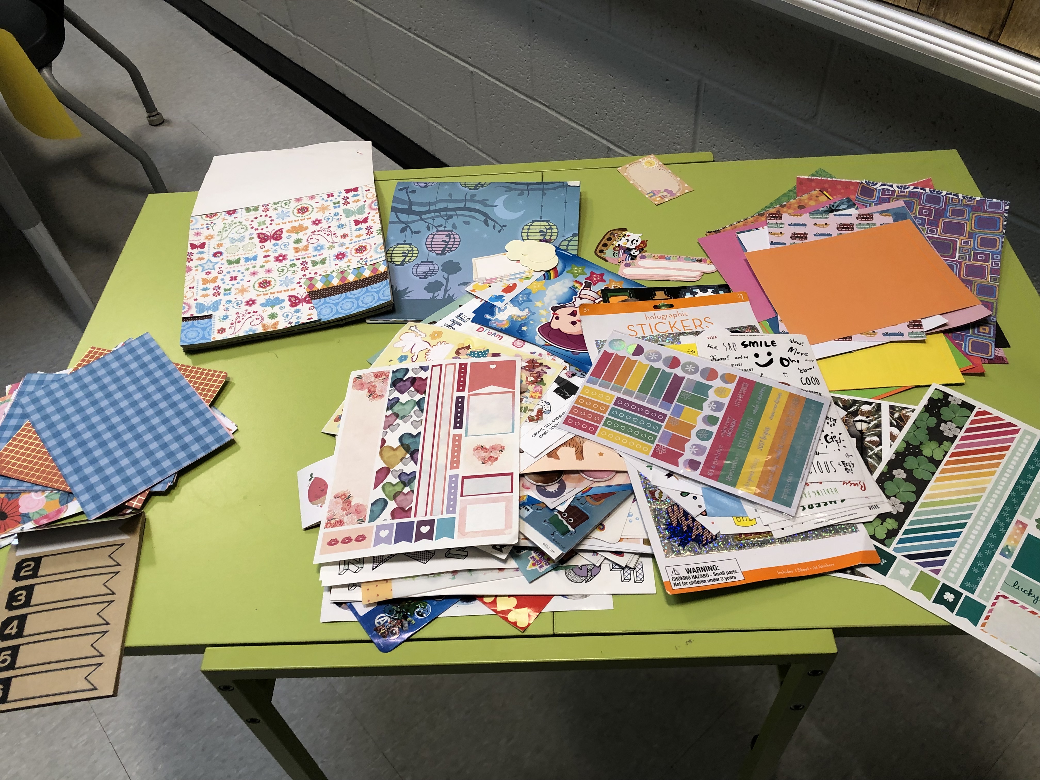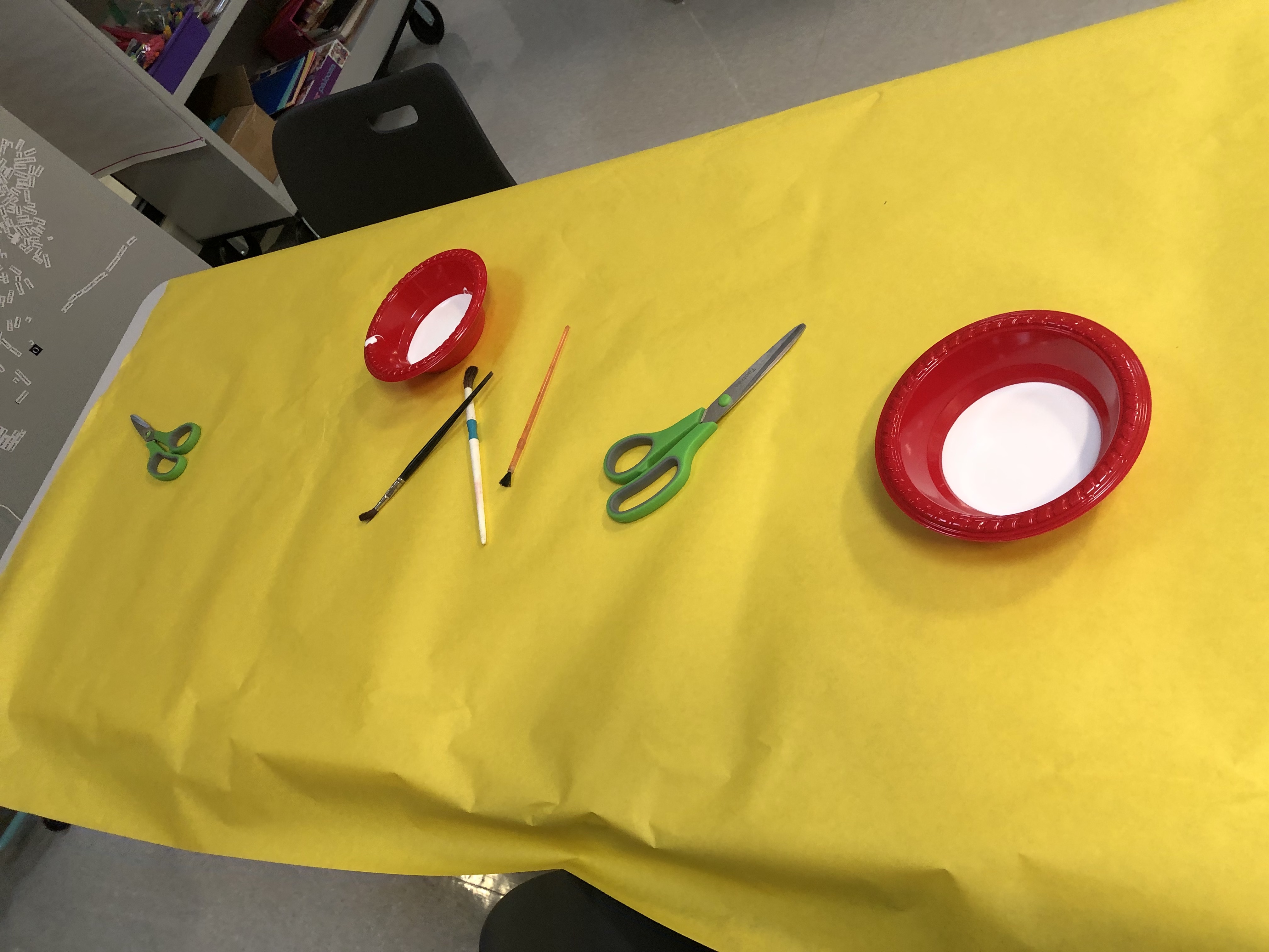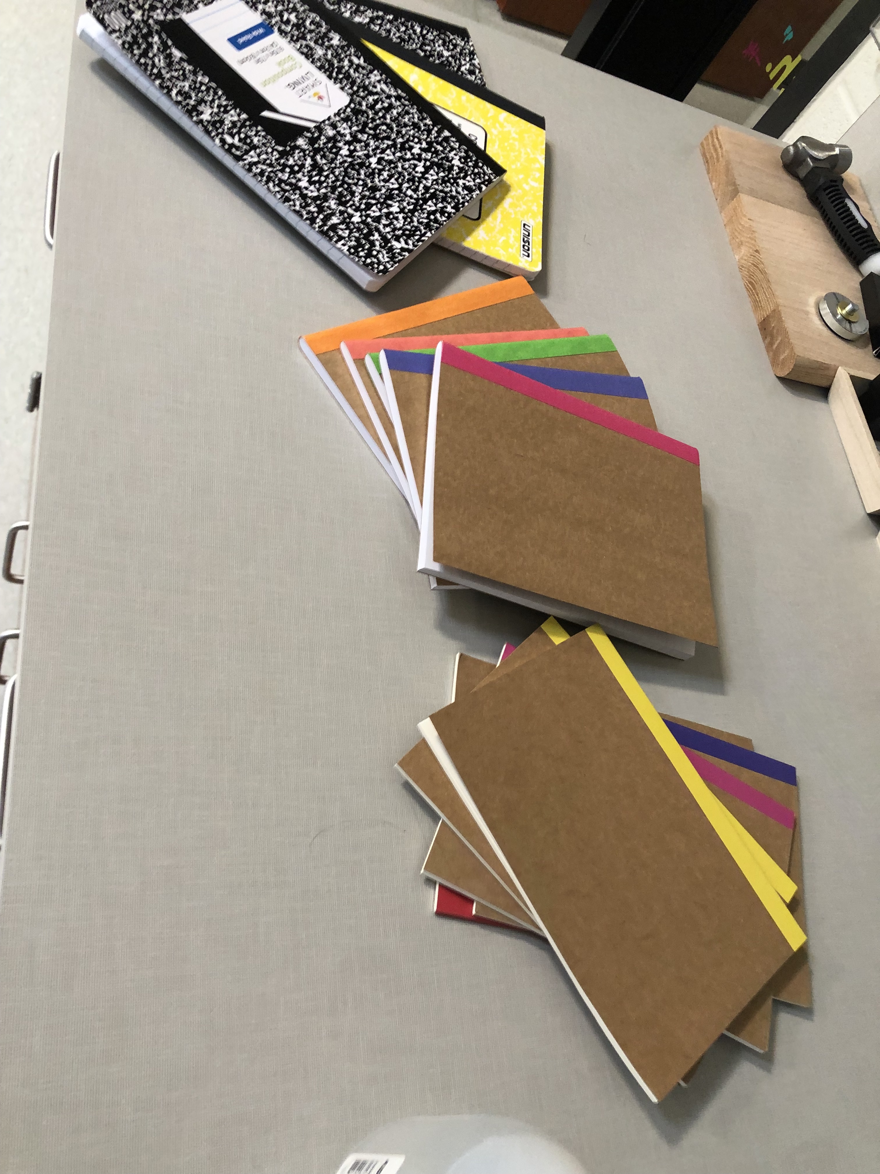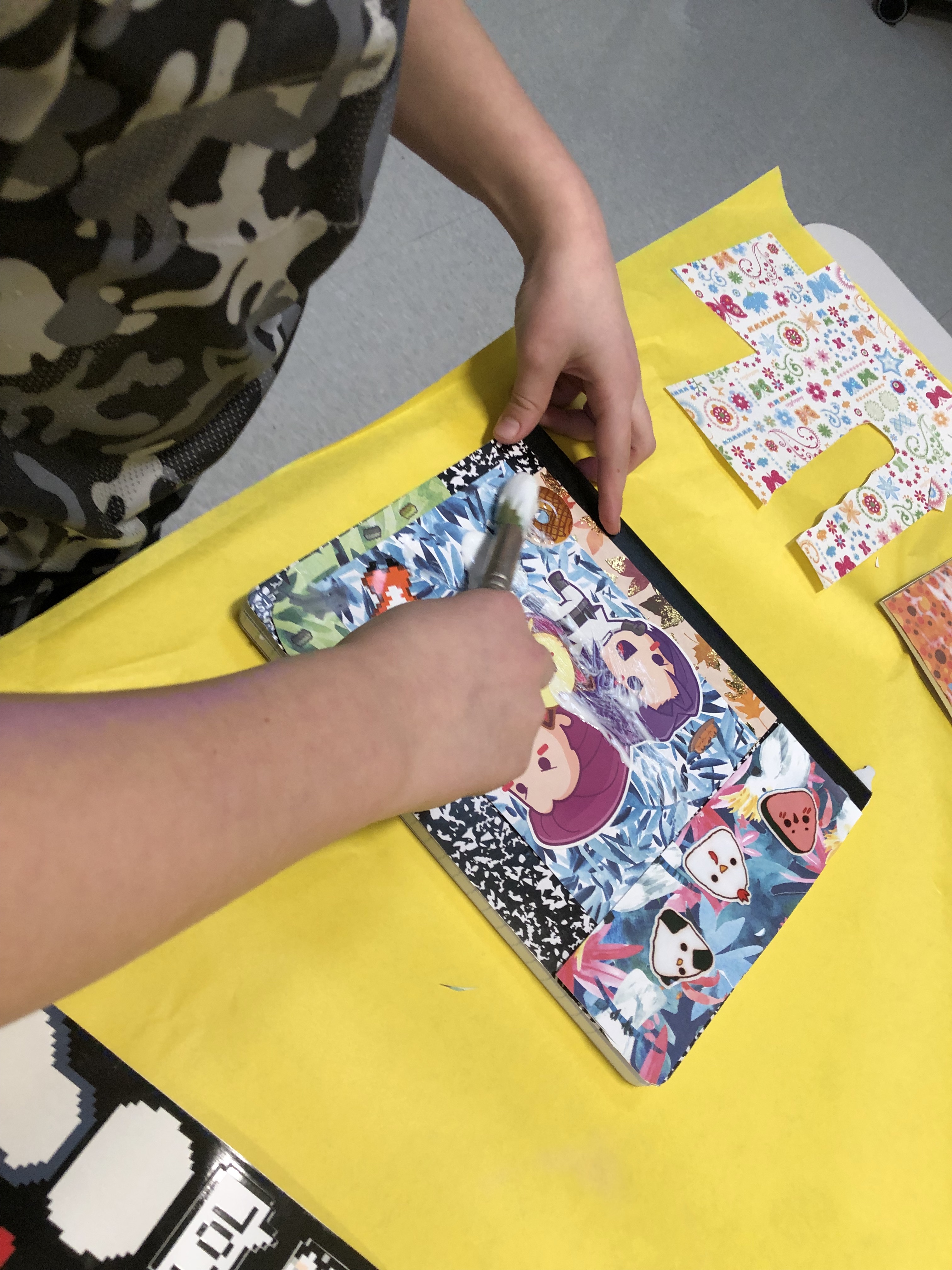 I set up my room with notebooks to choose from, paper-covered tables with bowls of mod podge, paintbrushes, scissors – and at the last minute I thought to add a paper towel at each seat.