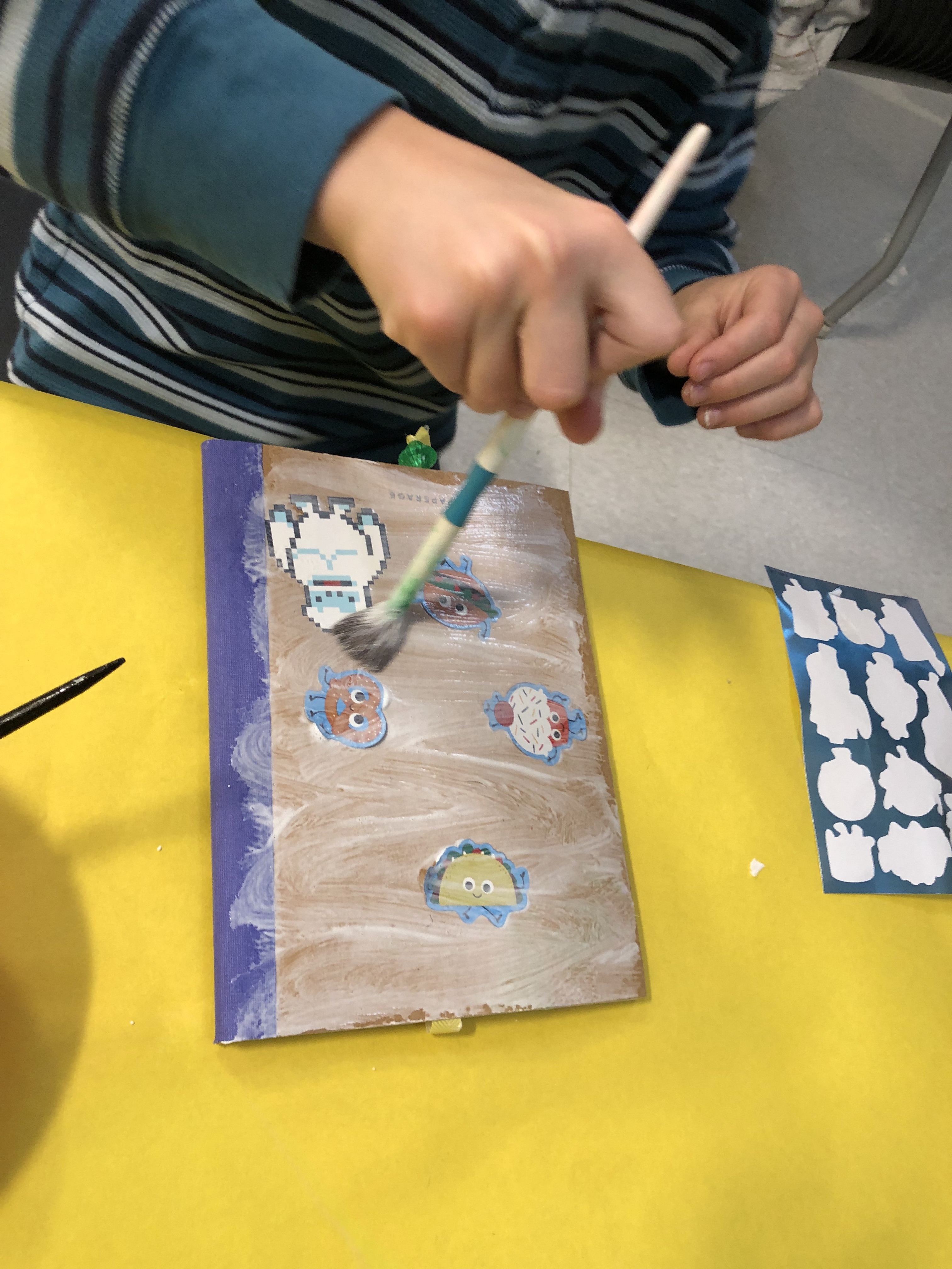Once everyone had their notebooks, I had to explain with mod podge was, and how you use it. One girl kept wondering, “So this is NOT glue? It’s mod podge?” and “So this is mod podge? It’s like glue?”