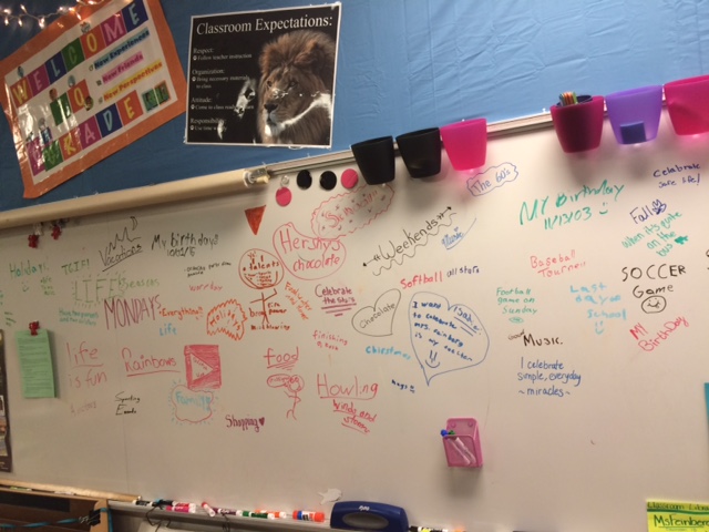 2. This year I teach 2 ELA classes back to back. I’ve just read I’m in Charge of Celebrations for the second time this morning. Before the school year started, I thought I would be bored teaching “the same” thing two times in a row. I’d like to call a celebration for that NOT happening. I’m anything but bored. Today I got to read I’m in Charge of Celebrations TWICE! Today I got to fill my board with even more celebrations with my second class. Today I get to connect with 50 students through the power of reading and writing. I’m lucky.